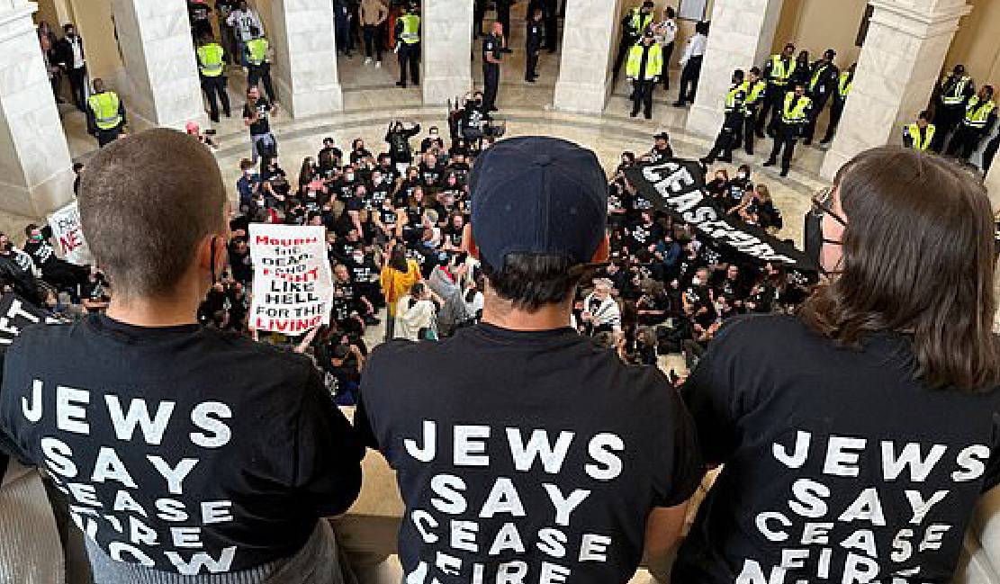 'קולות יהודיים לשלום' מתיימרים לייצג "יהודים המתארגנים למען שחרור פלסטיני ויהדות שמעבר לציונות". במקביל, מפגינים אחרים, תומכי חמאס גם כן שיבשו היום שימוע בוועדת החוץ של הסנאט לאישור מועמדו של הנשיא ג'ו ביידן לשגריר בישראל, ג'ק לו. המפגינים החלו לצעוק במהלך הצהרות הפתיחה ודרשו מישראל "הפסקת אש" וקראו נגד "רצח העם שישראל מבצעת"