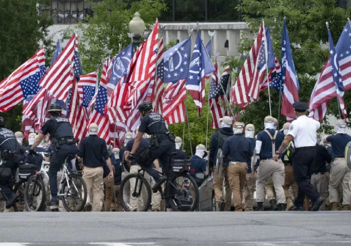 קבוצה ניאו-נאצית צועדת בוושינגטון הבירה, עם כיסוי פנים ודגלי ארה"ב הפוכים. מאי 2023
