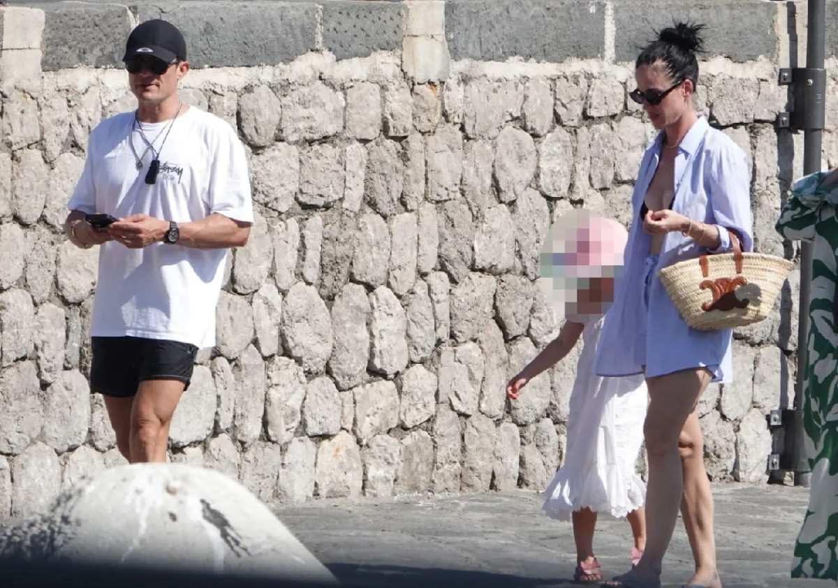 פרי, בת 40, נראתה בבגד ים שחור, כשבלום בן ה־48 מתרוצץ עם דייזי בת הארבע ומנשק אותה בחיבה. מאוחר יותר תועדו השלושה מטיילים בנחת, עוצרים לגלידה ונראים כמעט כמו משפחה רגילה בחופשה. פרי שילבה את בגד הים שלה עם חולצה פתוחה, מכנסיים קצרים, כפכפים ומשקפי שמש, ובלום לבש טי־שירט לבנה ומכנסיים שחורים.