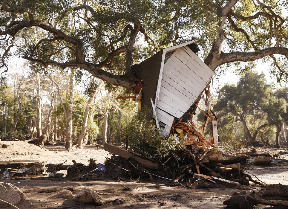 מבנה שהתנגש בעץ לאחר שמי שיטפונות שלחו בוץ ופסולת דרך שכונות מונטסיטו בשנת 2018