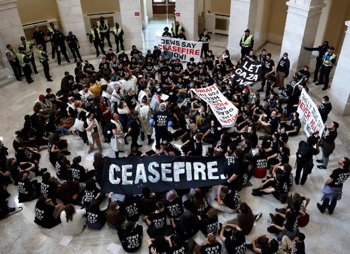 מפגינים מתנועת "קול יהודי לשלום" ו"אם לא עכשיו" מקיימים עצרת בדרישה להפסקת אש בעזה ברוטונדה של בניין המשרדים קנון האוס בוושינגטון הבירה ב-18 באוקטובר 2023.