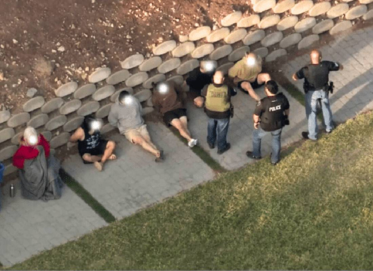 לפחות שישה אנשים נראו כבולים באזיקים, כולל אישה מבוגרת שבניגוד לשאר העצורים שישבו על הקרקע, ישבה על כיסא עם רגליה מכוסות תחת שמיכה. אישה נוספת נראתה יושבת על ספה חיצונית, מנגבת את עיניה בעודה מחזיקה ילד עטוף בשמיכה על ברכיה.