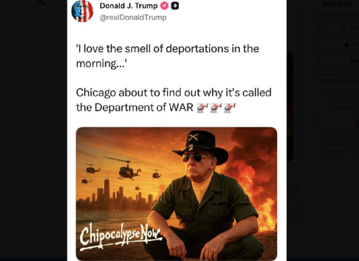 התמונה שכונתה "צ'יפוקליפסה עכשיו" (שילוב של שיקגו ו"אפוקליפסה עכשיו") הציגה את טראמפ חובש כובע המזכיר את דמותו של סגן־אלוף קילגור מהסרט, אותה גילם השחקן רוברט דובל.