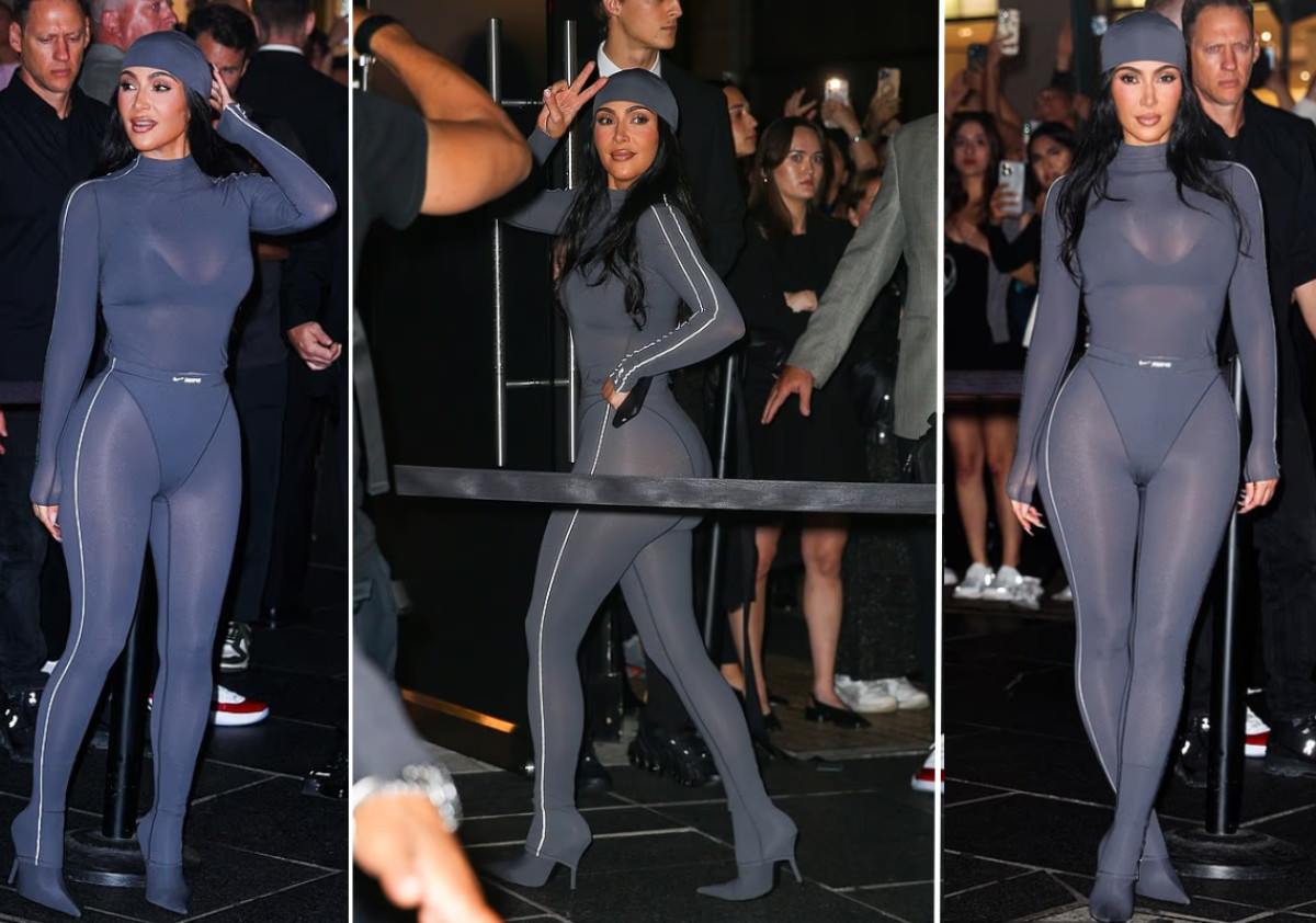 קרדשיאן בחרה אאוטפיט יוצא דופן - חליפת גוף, או catsuit, בצבע אפור שקוף, צמודה ומחמיאה, שעוצבה כחלק מהקולקציה החדשה. הפס הלבן בצידי הבגד והלוגואים של SKIMS ונייקי העניקו תחושה שמדובר בהלבשה תחתונה שנלבשה מעל, אפקט שנועד למשוך תשומת לב. היא השלימה את המראה עם בנדנה תואמת ונעלי עקב מחודדות בגוון אפור. שיערה הארוך והכהה נשאר גולש בגלים טבעיים, והאיפור הקפיד להדגיש את תווי הפנים החזקים שלה.
