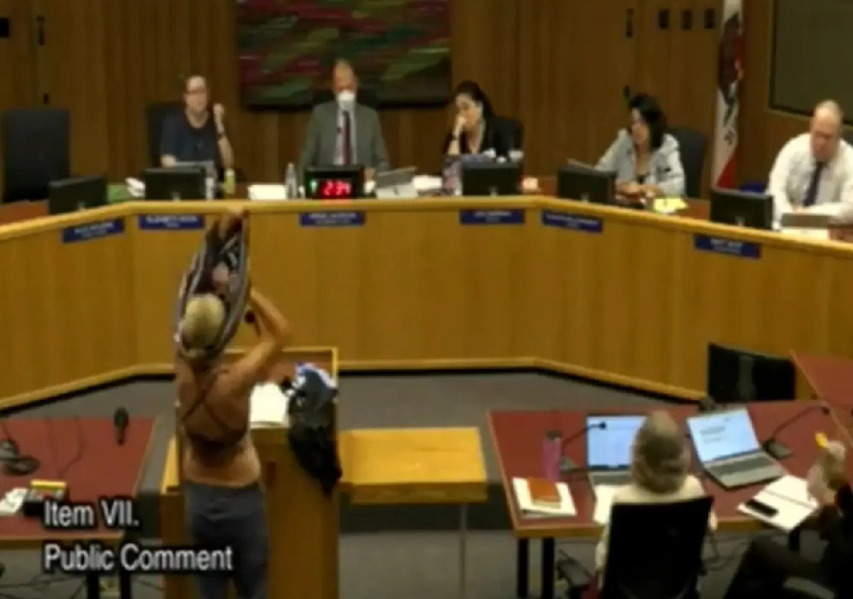 Stripped down to a bathing suit at a California School Board meeting, asking officials: "If you are disrupted by a 50-year-old woman in a… pic.twitter.com/4XHgHPYVB0