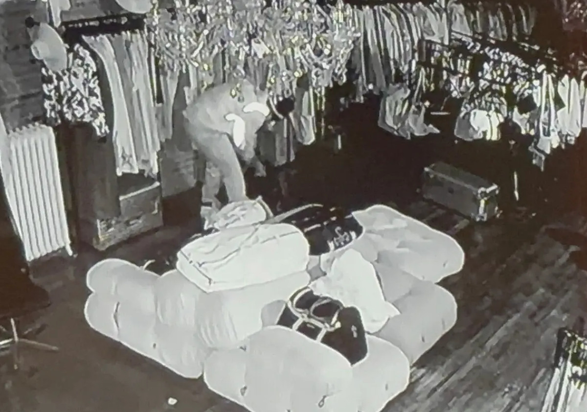 צילומי האבטחה מציגים את הפריצה עצמה: החלון נופץ, ארבעת הגברים מזנקים פנימה, ממלאים תיקים בבגדי יוקרה ואביזרים שמחירם מגיע לאלפי דולרים, ונעלמים שוב אל הרחוב החשוך.